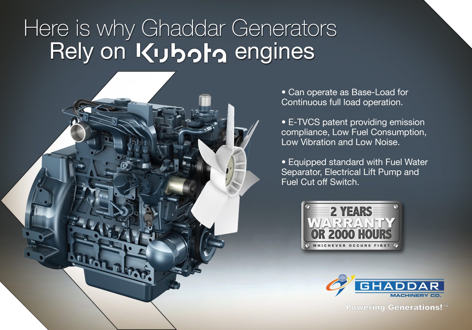 Can operate as Base-Load for Continuous full load operation E-TVCS patent providing emission compliance, Low Fuel Consumption, Low Vibration and Low Noise. Equipped standard with Fuel Water Separator, Electrical Lift