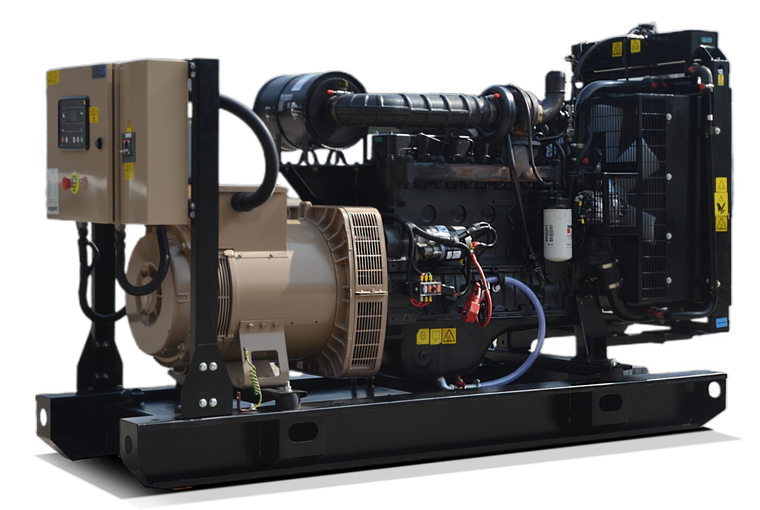 - Skid-mounted fuel tank supplied with fuel gauge, filler cap, fuel inlet and outlet hoses.